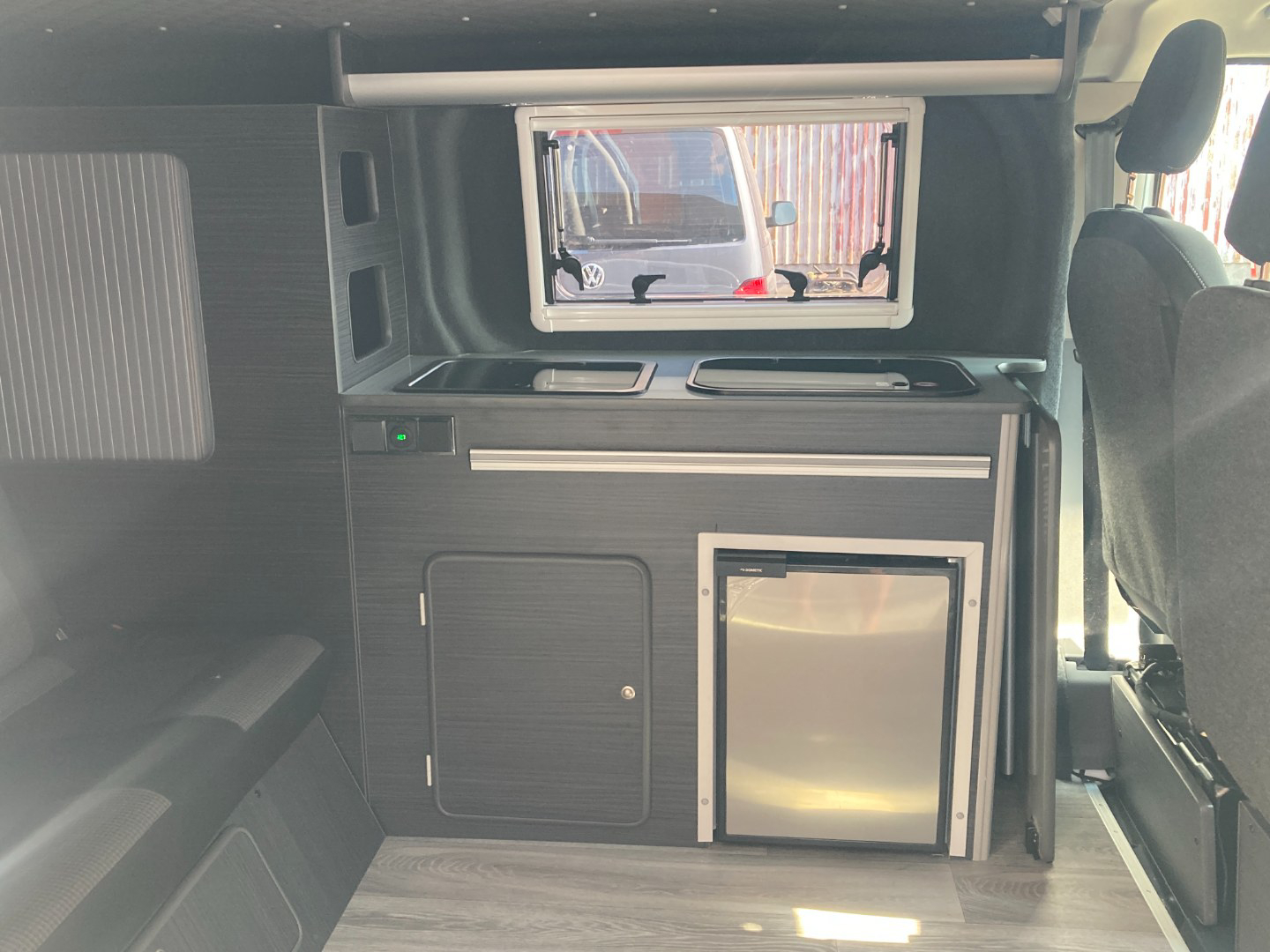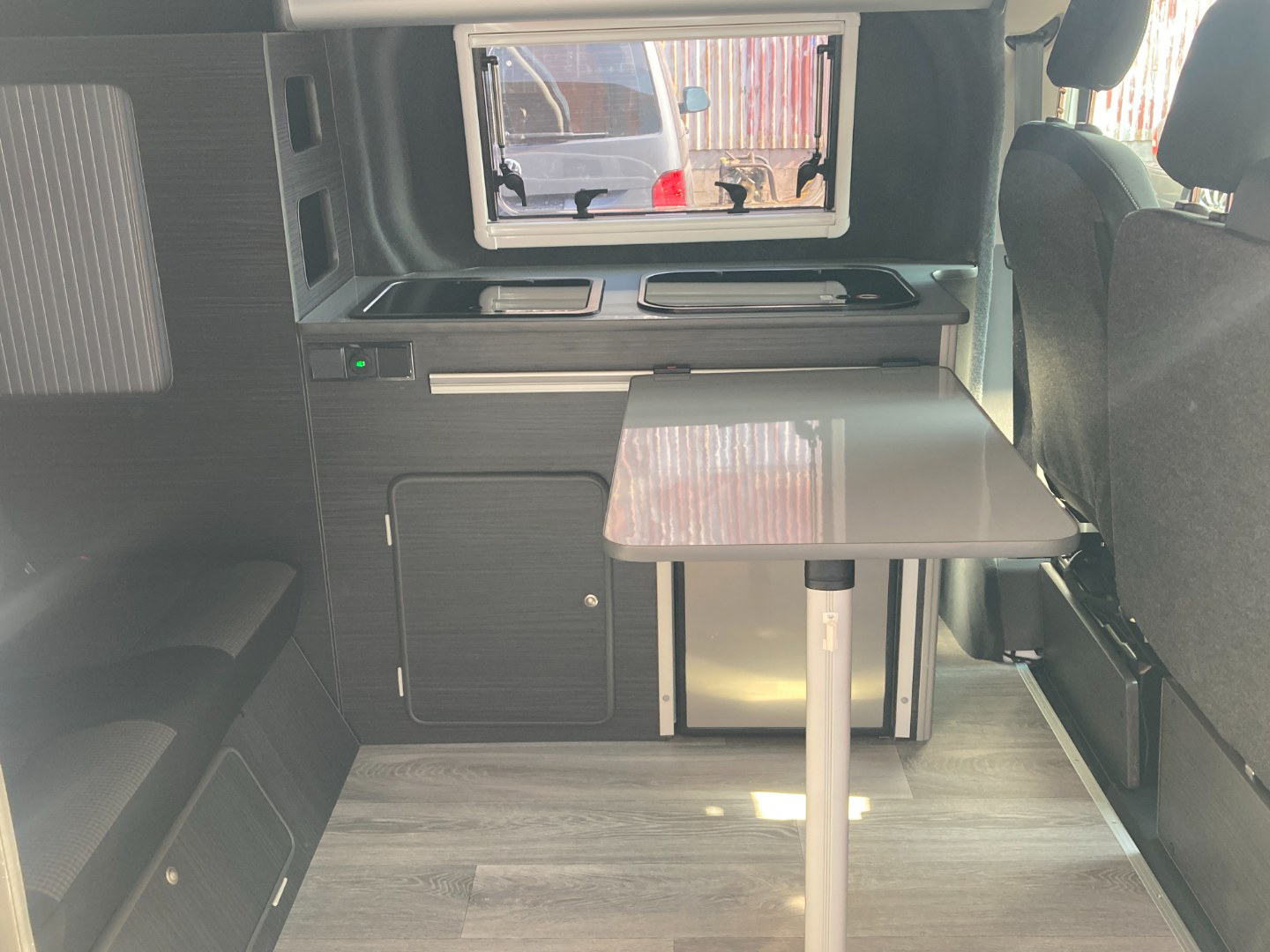 Co obsahuje CALIFORNIA STYL vestavba. Navýšení na 4 - 5 míst k sezení a 2 – 5 míst na spaní. Nábytková skříň s kuchyňskou linkou, stůl, kompresorová lednice 50l, vařič, dřez, zásobníky na vodu, (možná sprcha), WC, zadní dvousedačka s pásy, rozkládací dvojlůžko s matrací, kompletní izolace interiéru, kompletní čalounění interiéru, přípojka 230V, druhá 12V baterie + indikátor nabití, nabíječka 230V, podlahová deska s PVC krytinou, instalace. Tato vestavba je možná do všech podobných typů dodávek.