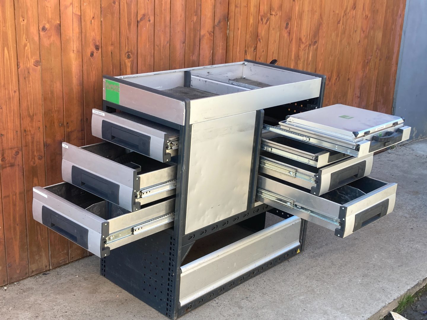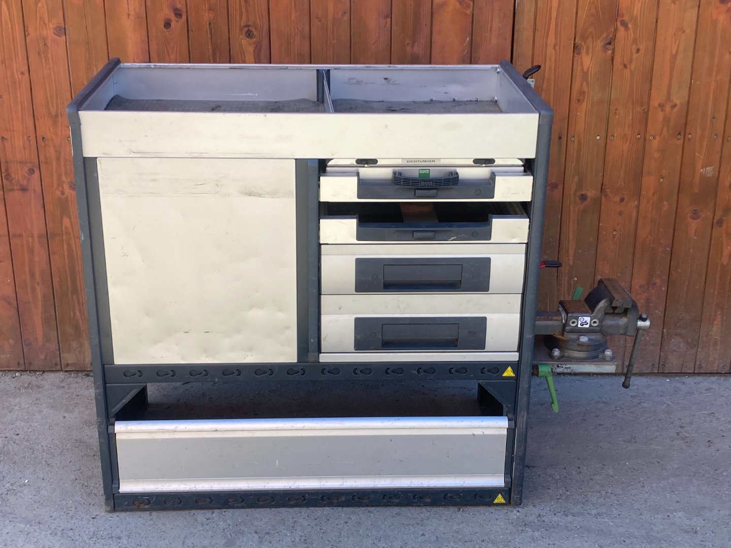 BOTT servisní dílenská vestavba do vozidla 103 x 100x 53 cm. Vestavba pro dělníky do dodávek typu VOLKSWAGEN TRANSPORTER, VW CADDY a další, pro každou profesi. Regály se 7mi šupíky na nářadí a svěrákem - pojízdná dílna pro řemeslníky.
