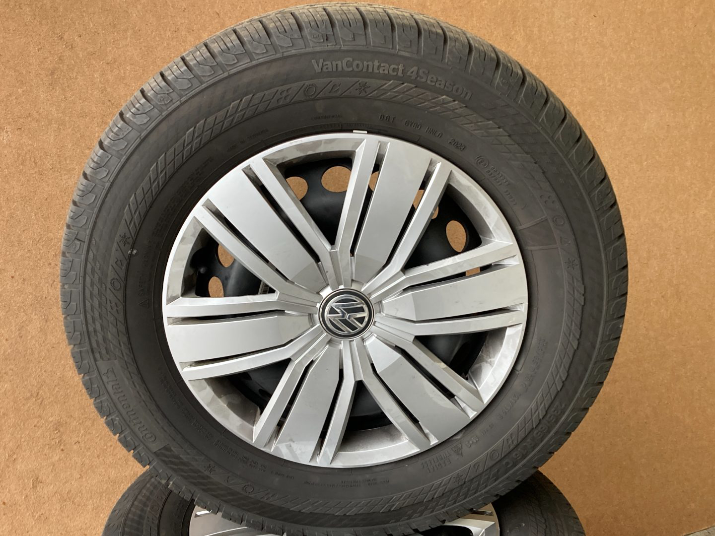 4x plechové disky ORIGINÁL VOLKSWAGEN rozteč 5x112mm. Zimní pneu CONTINENTAL 235 65 R16 C vzorek 8mm (CRAFER, MAN)